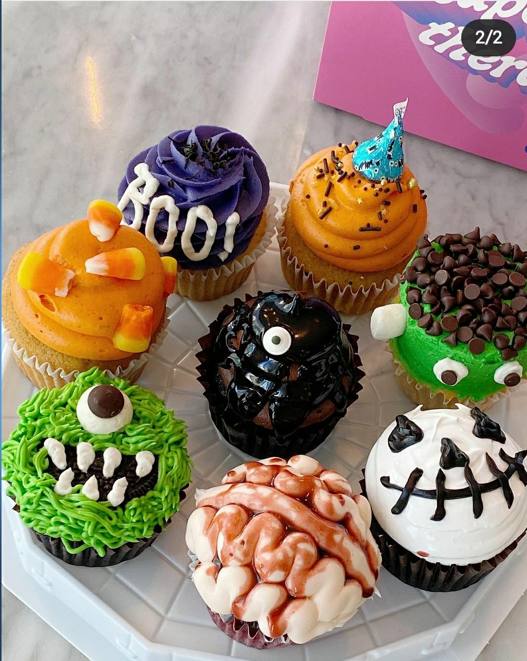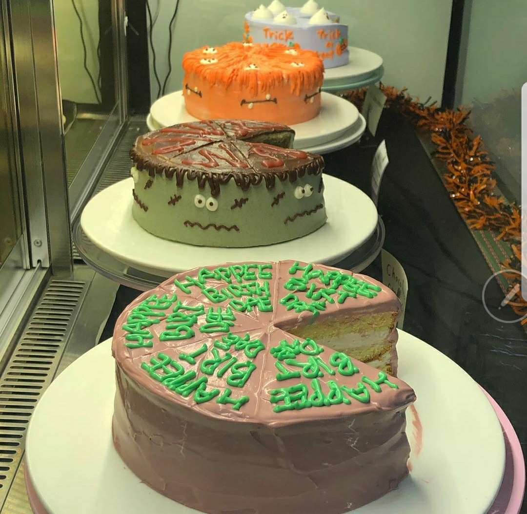 This place famous for their cake is offering a pumpkin (not spice) cake. It looks super cute and aesthetically pleasing with an outside color of pale orange with orange layers inside. It has pumpkins as decorations on he slices and surprised ghosts on the top. There is also the available option of a pumpkin cake that is covered in “eyeballs” and topped with ghosts.