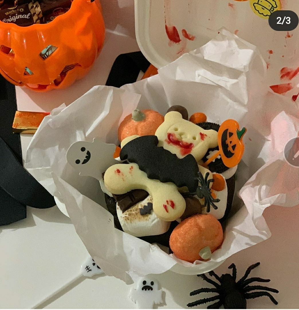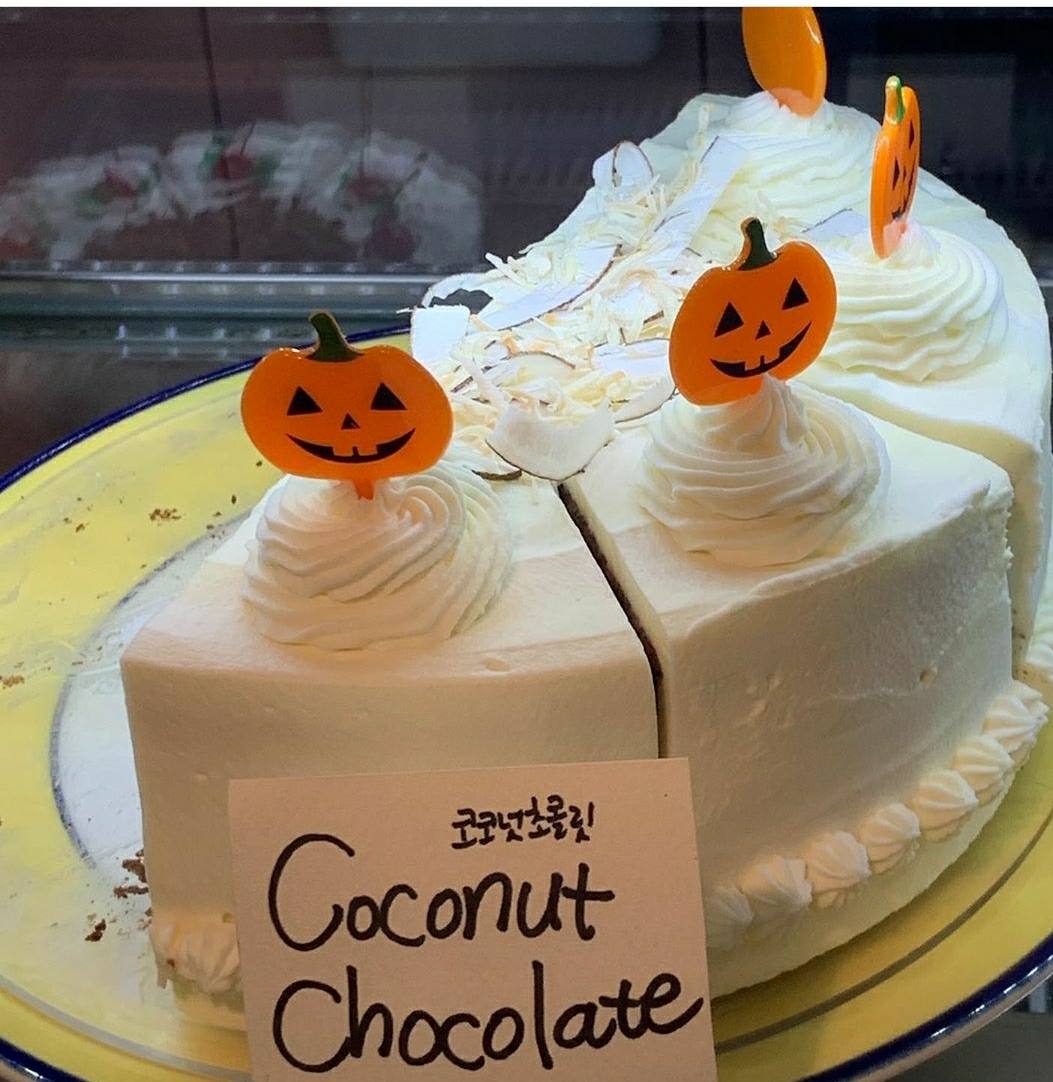 ์ด์ฝ์ปต์ผ์ต) and a Coconut Chocolate Cake (์ฝ์ฝ๋์ด์ฝ๋ฆฟ) (with jack o’lantern or ghost toothpicks inserted onto the top. They also have a Halloween Raspberry Pie (๋ผ์ฆ๋ฒ ๋ฆฌํ์ด) that looks like an eyeball, and a Halloween Parfait (with a base of almond and chocolate cereal, followed by marshmallow, topped with chocolate mint ice cream, fresh cream, strawberry syrup, and a peanut butter cookie with an “eyeball.”)