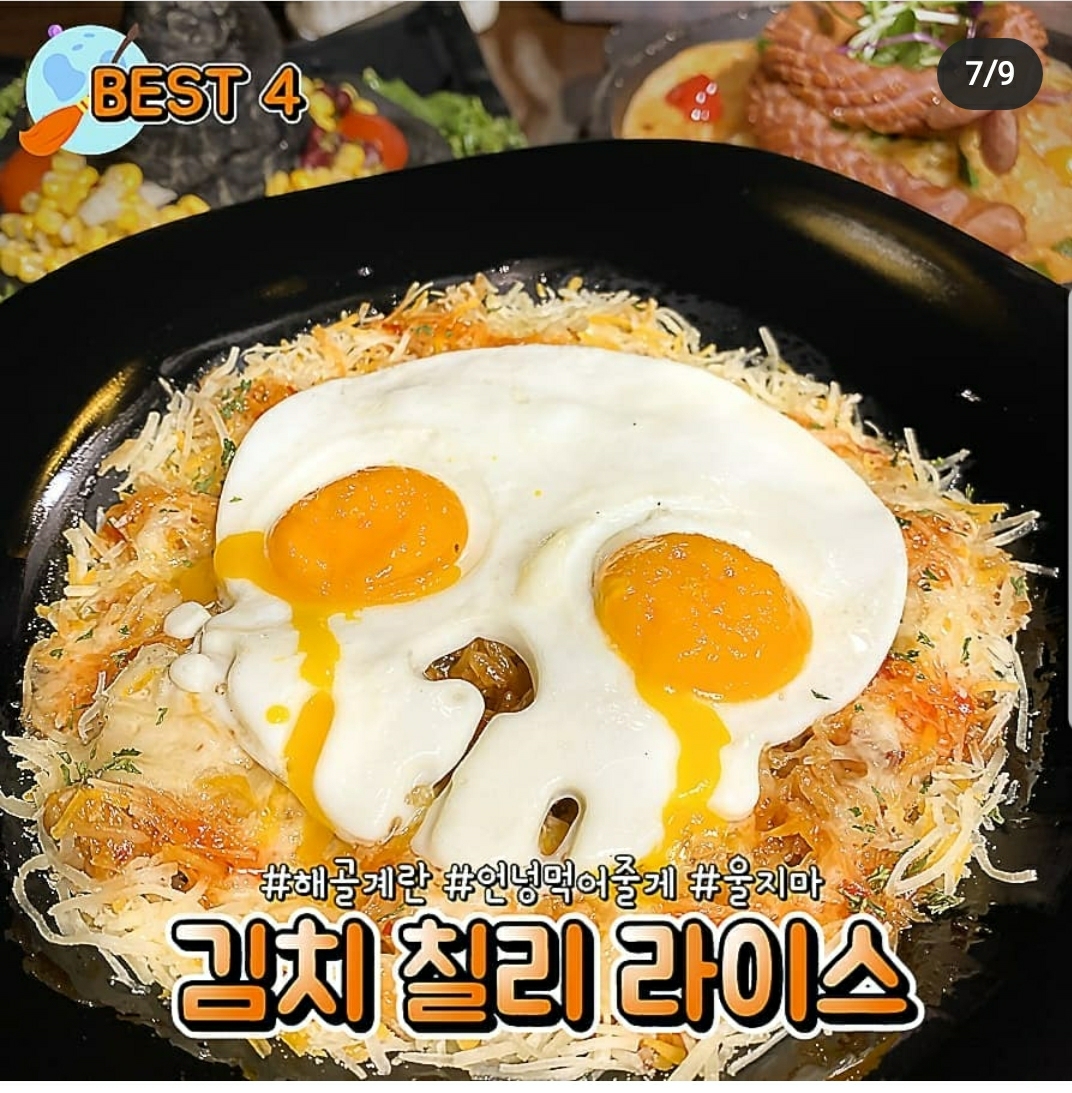 Seorae Banjiha is a brunch cafe with a menu that covers so many different kinds of items such as nachos and salsa, chicken karaage, sausage and korean rice cakes, craft beer a and french toast. Their usual cookies look scrumptious. As a Halloween addition to the menu, they are serving lattes with eyeball meringue cookies on top and Halloween sundaes. The sundae is said to taste like a “๋ผ์ง๋ฐ” or a pig bar. It’s the individual ice cream bars that we can compare to eclair ice cream bars back home in the west. It has vanilla ice cream, strawberry jam/syrup and pieces of chocolate. Added to that is a skeleton head and an eyeball meringue.