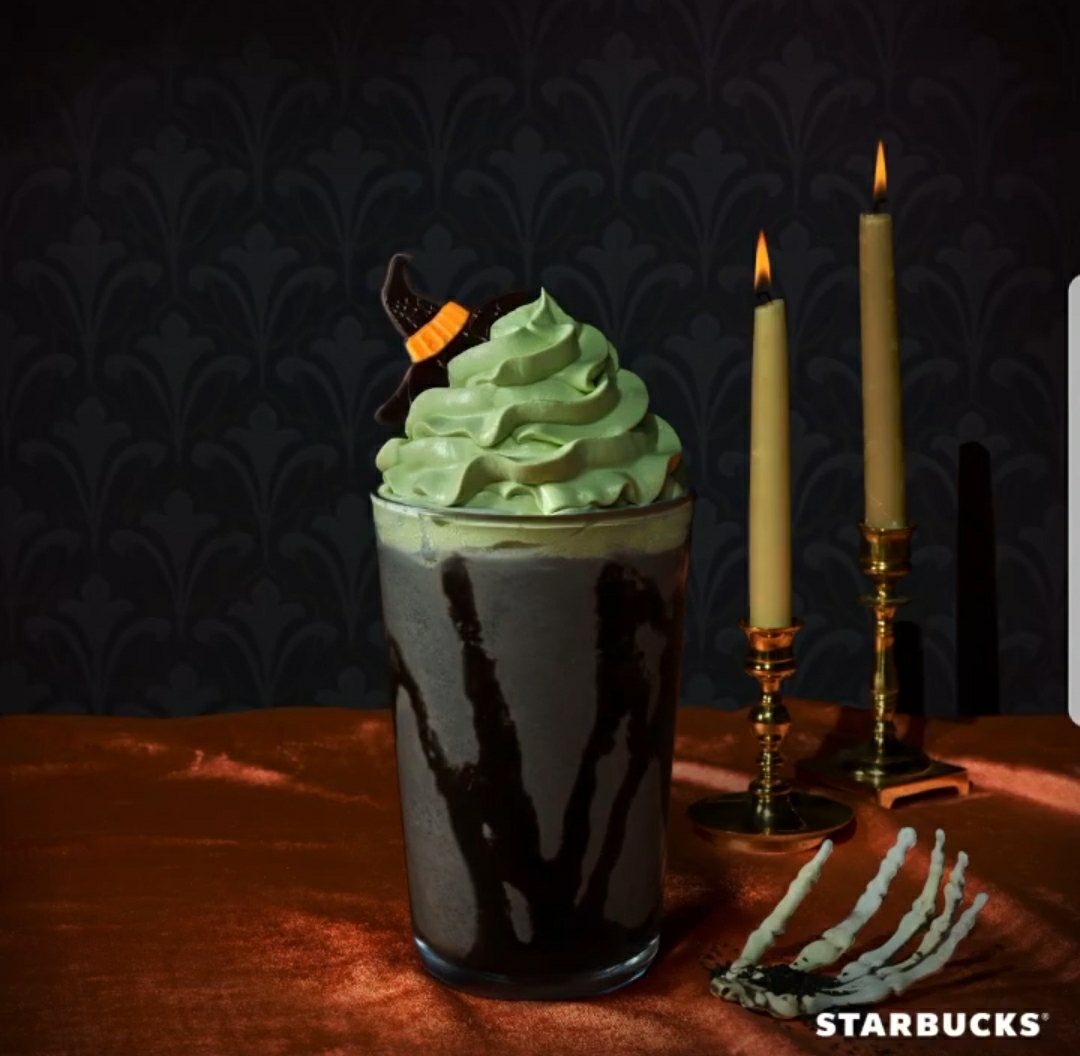 ธ (Franken Shoux Cookie Frappuchino). The drink is a sweet custard mixed with crispy chocolate cookies and green tea sauce. It can be topped with a monster or skull shaped chocolate topping.